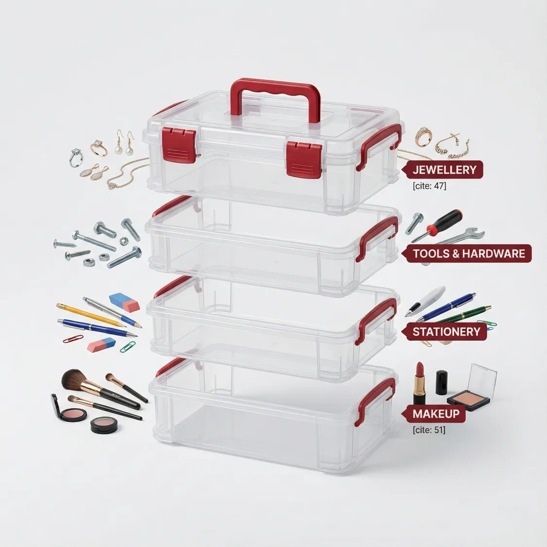 The clear transparent body helps you quickly identify contents without opening each compartment, saving time and effort. Built with strong side locking clips, all layers remain firmly secured during movement, while the top carry handle makes the box easy to transport anywhere—whether at home, office, workshop, or while traveling.